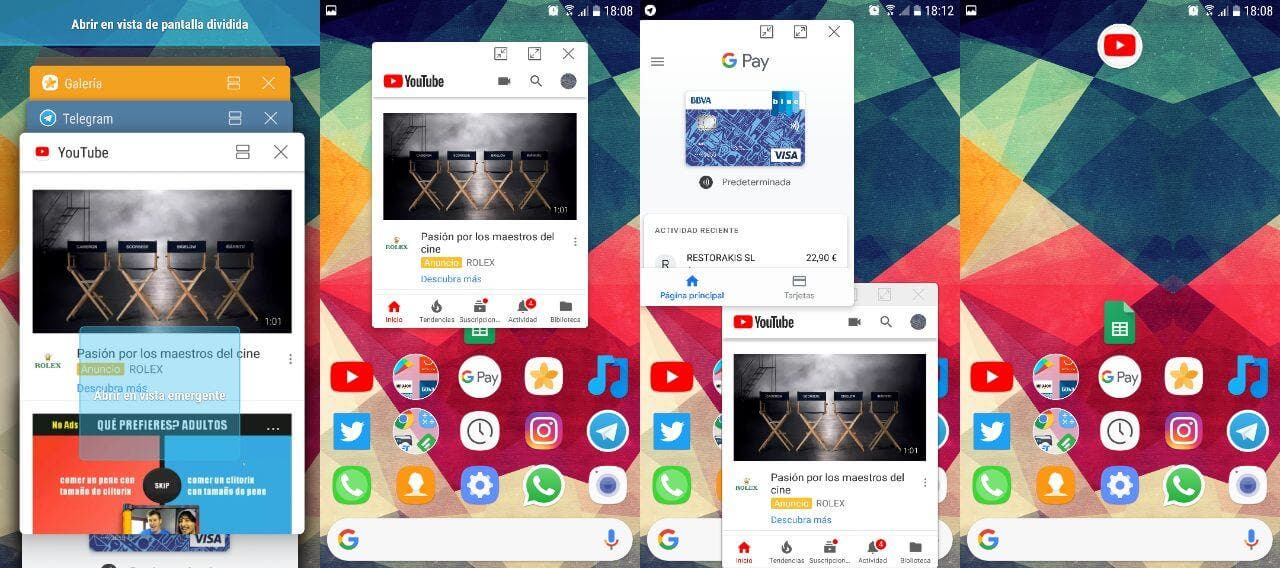 Para poder tener una ventana flotante en tu pantalla con la aplicación que quieras tan solo debes abrirla, ir hasta las aplicaciones recientes y dejarla pulsada. Cuando hagas esto verás que una zona de color azul te indica que si arrastras hasta ahí la tarjeta de la aplicación se abrirá en una ventana flotante. Si lo haces, esta aplicación pasará a estar en una pequeña ventana en la pantalla de inicio, aunque también estará ahí si abres otra aplicación como un navegador, por ejemplo.