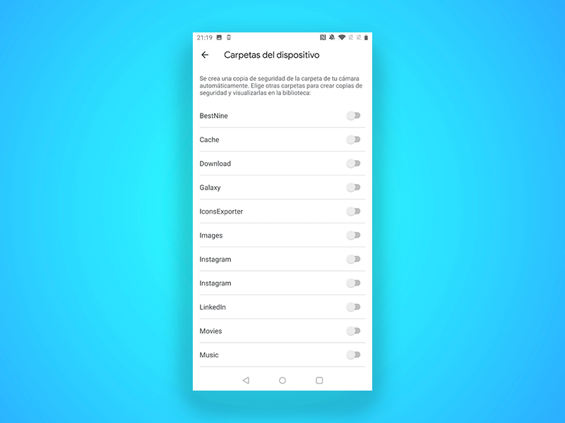 Esta es una de las configuraciones más importantes de Google Fotos. Por defecto, la aplicación solo hace la copia de seguridad de las fotografías que realizas con la aplicación de cámara. Imágenes de WhatsApp, Telegram u otras aplicaciones quedan fuera de esta copia de seguridad.