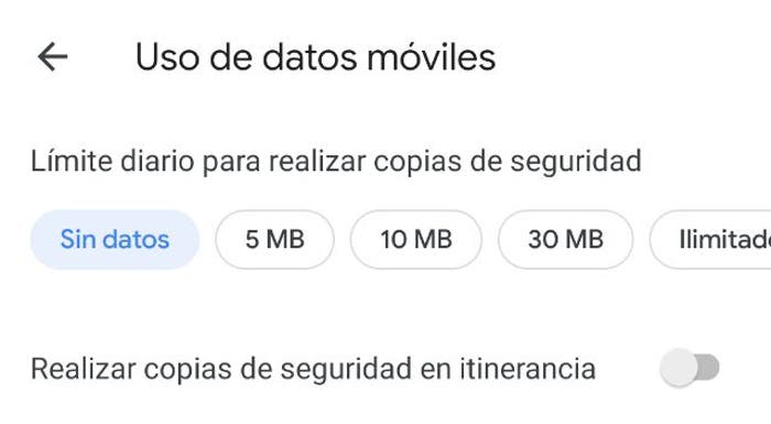 Lo mejor y más recomendable es tener esta configuración en la opción ‘Sin datos‘, para no gastar tu preciada tarifa y que las fotografías se suban a la copia de seguridad mediante una red Wi-Fi cuando llegues a casa.