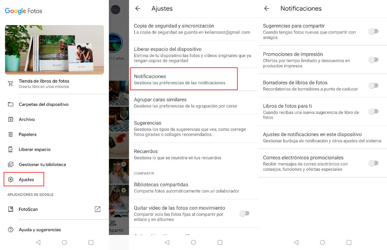¿Google Fotos te molesta todos los días con notificaciones sobre sus productos? Si entras en los ajustes de la aplicación y después en ‘Notificaciones‘ podrás seleccionar qué tipo de avisos quieres recibir por parte de Google Fotos.