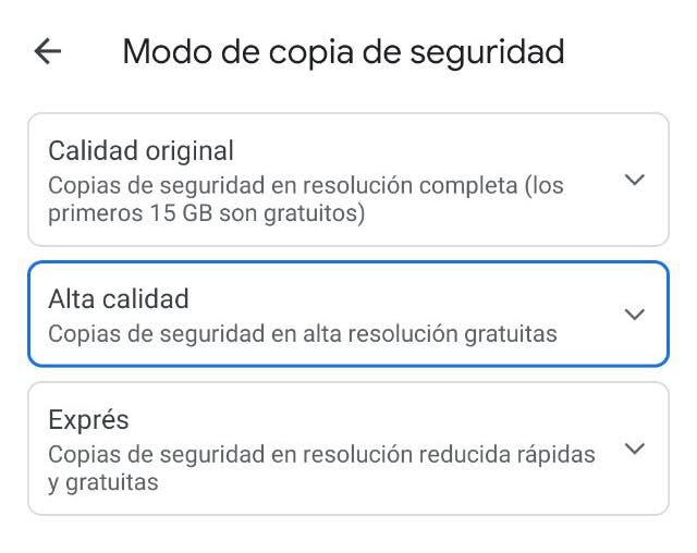 Google Fotos permite almacenar la copia de seguridad en sus servidores de diferentes maneras. Puedes pensar que lo mejor es configurar el modo ‘Calidad Original‘, pero debes saber que con este modo solo tendrás 15 GB gratuitos.