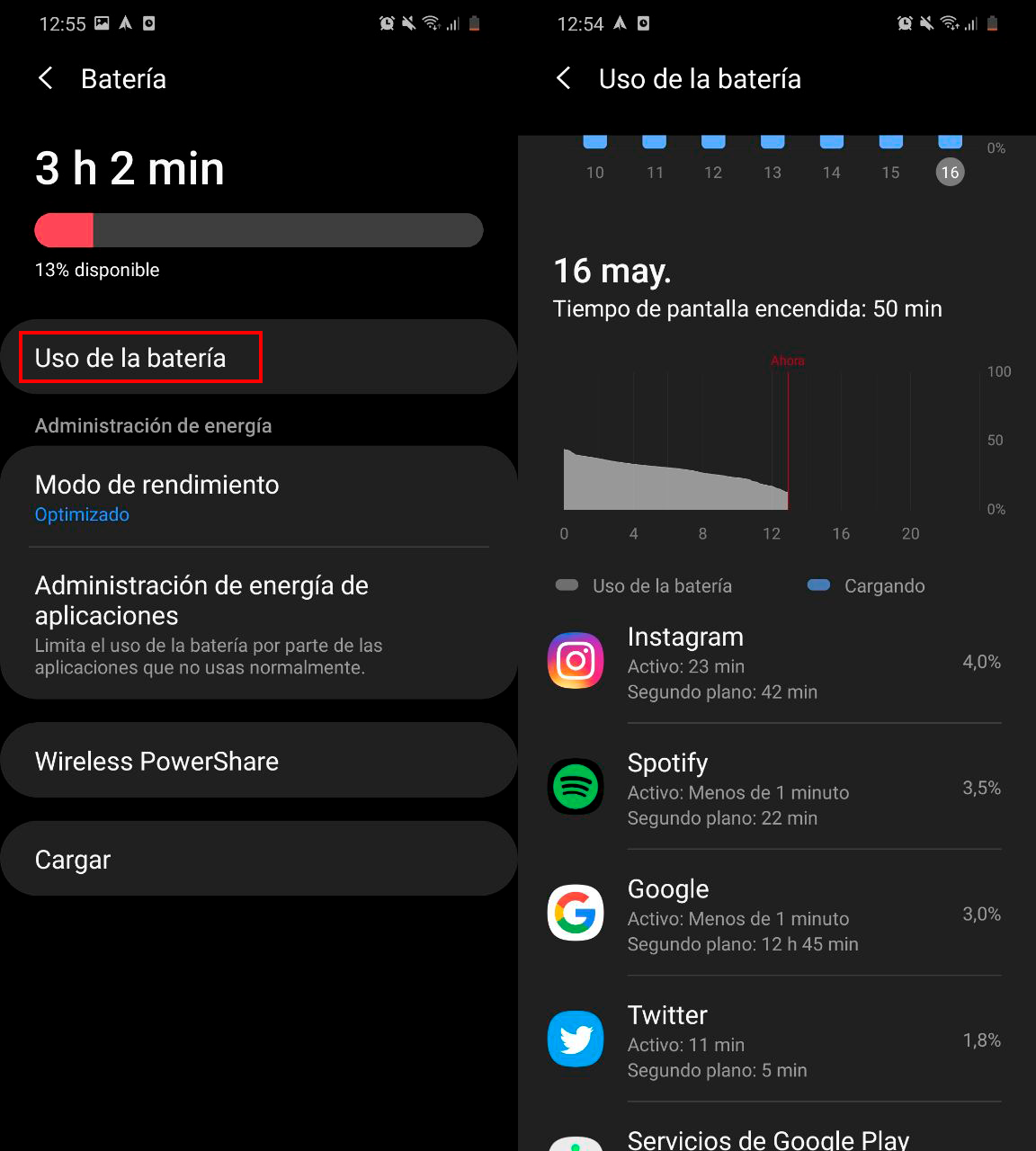 En este apartado podrás ver una gráfica de cómo gastas tu batería y también una lista de aplicaciones ordenadas de mayor a menor gasto. Este apartado te deja con información sobre tiempo de uso de cada aplicación, porcentaje de batería gastado y también el tiempo de uso en segundo plano. Gracias a este apartado podrás saber si una aplicación gasta más de lo debido en primer o segundo plano.