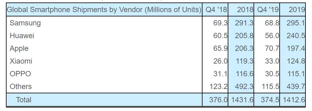 Si comparamos los datos de 2019 con los de 2018 nos encontramos con subidas en casi todas las marcas, excepto en dos. Apple y Oppo vendieron menos en 2019 que en 2018. En el caso de Apple las ventas bajan en casi 10 millones de smartphones anuales, algo preocupante para la compañía de Cupertino.