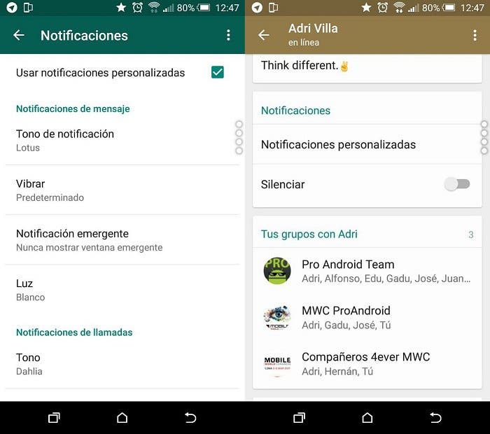 Otra cosa que también podemos ver justo encima de la opción de silenciar, es «notificaciones personalizadas». Esto es bastante simple, pero nos puede ahorrar algo de tiempo para saber quien nos habla sin necesidad de mirar la pantalla. Aquí, tendremos la opción de elegir un tono para cada persona, que nos muestre la notificación emergente, que vibre o que nos muestre un tono de led diferente al predeterminado.