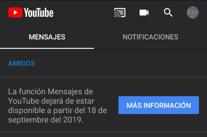 Si en estos momentos entras en el apartado de mensajes podrás ver una notificación de YouTube sobre el cierre de dicho apartado. Será a partir del día 18 de septiembre cuando este servicio desaparezca y no se pueda volver a utilizar más. Con él desaparecerán todos los mensajes y conversaciones que hayas tenido, aunque puedes descargar dichas conversaciones previamente para no perderlas. Eso sí, debes hacerlo antes del 18 de septiembre, pues después no será posible.