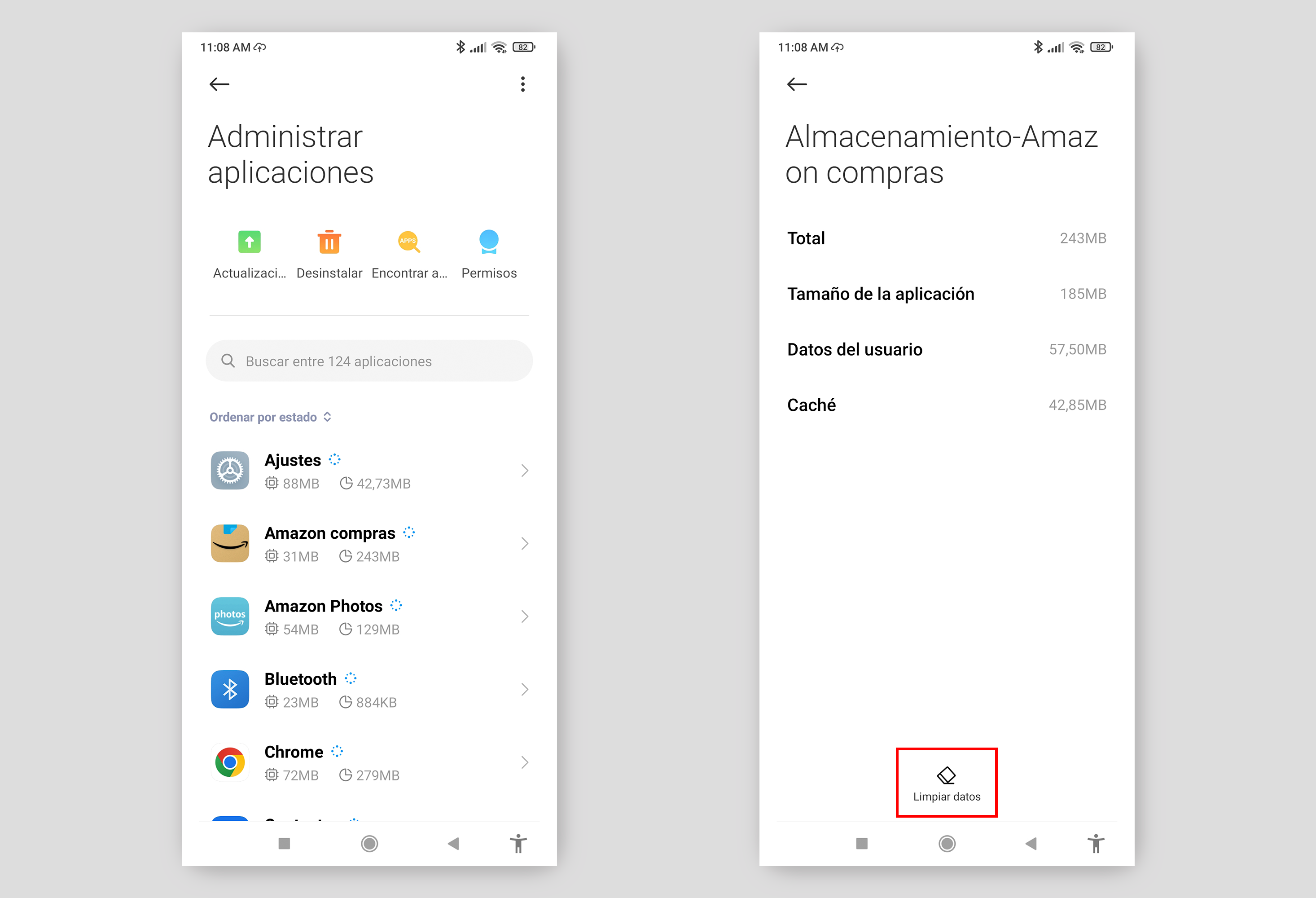 En este lugar encontrarás todas las apps que tienes instaladas en tu dispositivo y cuánto están ocupando. Es posible que alguna esté ocupando varios GB y quieras borrarla para después volver a instalarla. Esto hará que los datos almacenados se borren y después ocupe mucho menos.