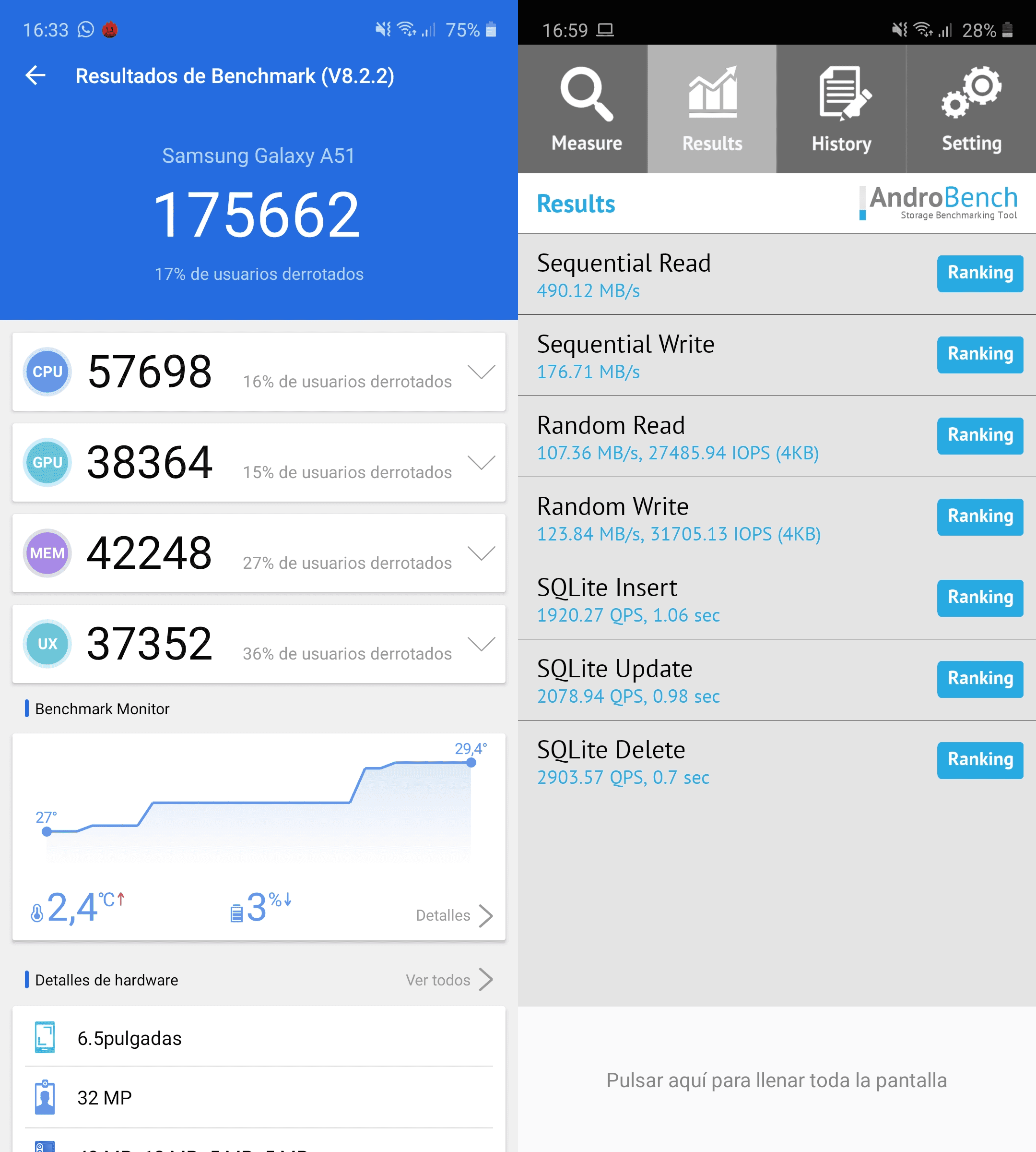 Respecto al almacenamiento escogido, hemos realizado una prueba con AndroBench y podemos ver que tiene una velocidad de lectura de casi 500 MB/s. Es una mejora significativa respecto a la gama media habitual, pero no alcanza los números de la gama alta, como era de esperar.