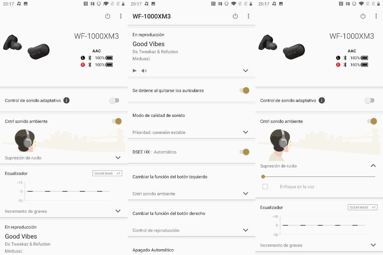 Por supuesto, puedes elegir si quieres activar o no la cancelación de ruido activa. Cuando la pruebes podemos asegurarte que querrás tenerla siempre activa. Eso sí, con la aplicación de Sony podrás establecer en qué grado: tiene 12 niveles de intensidad y un modo que detecta la situación en la que estamos para activar o no esta cancelación de ruido.