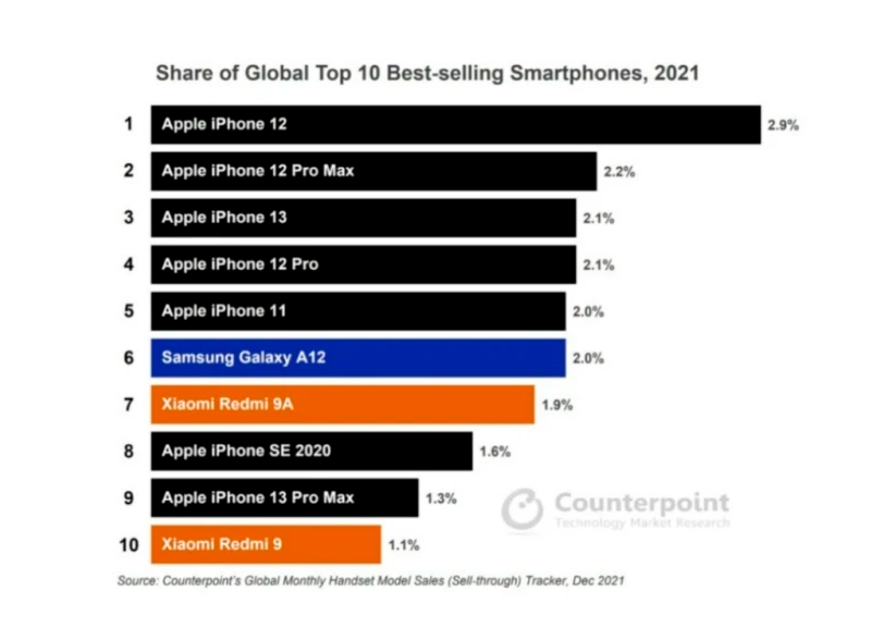 El estudio realizado por Counterpoint Research revela cuáles son los 10 móviles más vendidos del planeta en el año 2021. Todos los países están incluidos y también todos los modelos más relevantes. La lista revela que en el TOP 5 solo hay móviles de Apple. Y en todo el TOP 10 solo 3 móviles Android consiguen colarse.