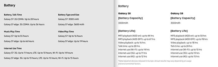 Como se puede observar en la imagen, según las cifras oficiales de Samsung el rendimiento de la batería del S8 y del S7, al igual que la del S8+ y S7 Edge estarían muy parejos. Comenzando por la comparativa del S8 con el S7, el primero lograría alcanzar las 67 de reproducción de música, superando las 55 de su predecesor, pero en cuanto a tiempo de llamada reduciría su capacidad de 28 a 20 horas. Por otro lado, en conectividad andarían muy parejos, por no decir prácticamente iguales logrando 11 horas de conexión 3G, 12/13 de 4G y 14 de conexión WiFi.