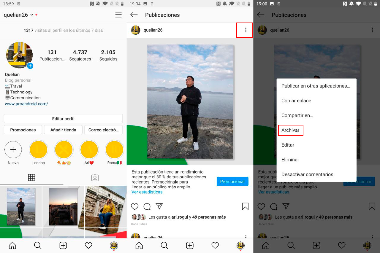 Con estos sencillos pasos será suficiente para que la imagen o el vídeo se oculte y nadie tenga acceso a su visualización. Ni siquiera tú la verás en el perfil. Para acceder a ella debes volver a tu perfil, abrir el menú lateral derecho y pulsar sobre ‘Archivar’.