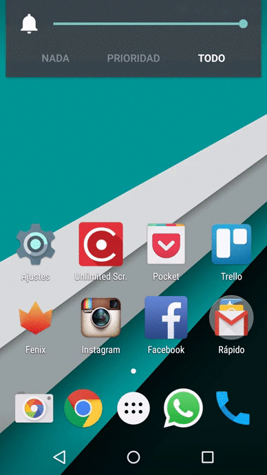 Otra cosa que podremos hacer desde esta versión es poder entrar en el modo de no molestar o lo que es lo mismo, no dejar que entre ninguna notificación que nos pueda distraer. Podremos definir el tiempo en el que no queremos que nos molesten o simplemente dejarlo activado indefinidamente. Cuidado al activar esta funcionalidad porque si seleccionamos «NADA» no sonara la alarma. «PRIORIDAD» es otro modo de hacer llegar las notificaciones pasando un filtro que nosotros hayamos configurado desde los ajustes de las notificaciones.