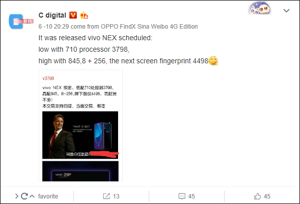 Efectivamente, el Vivo Nex supera al cambio la barrera de los 500 euros. No es algo que nos preocupe, ya que la compañía necesita vender estos terminales algo más caros que la competencia para poder recuperar la inversión en las nuevas tecnologías. El Vivo Nex S se ha filtrado con un precio de 4498 yuanes, que son unos 600 euros al cambio. Como ya os dijimos, estos dispositivos solo se venderán en China, por lo que hacer el cambio a euros es un poco innecesario por el momento.