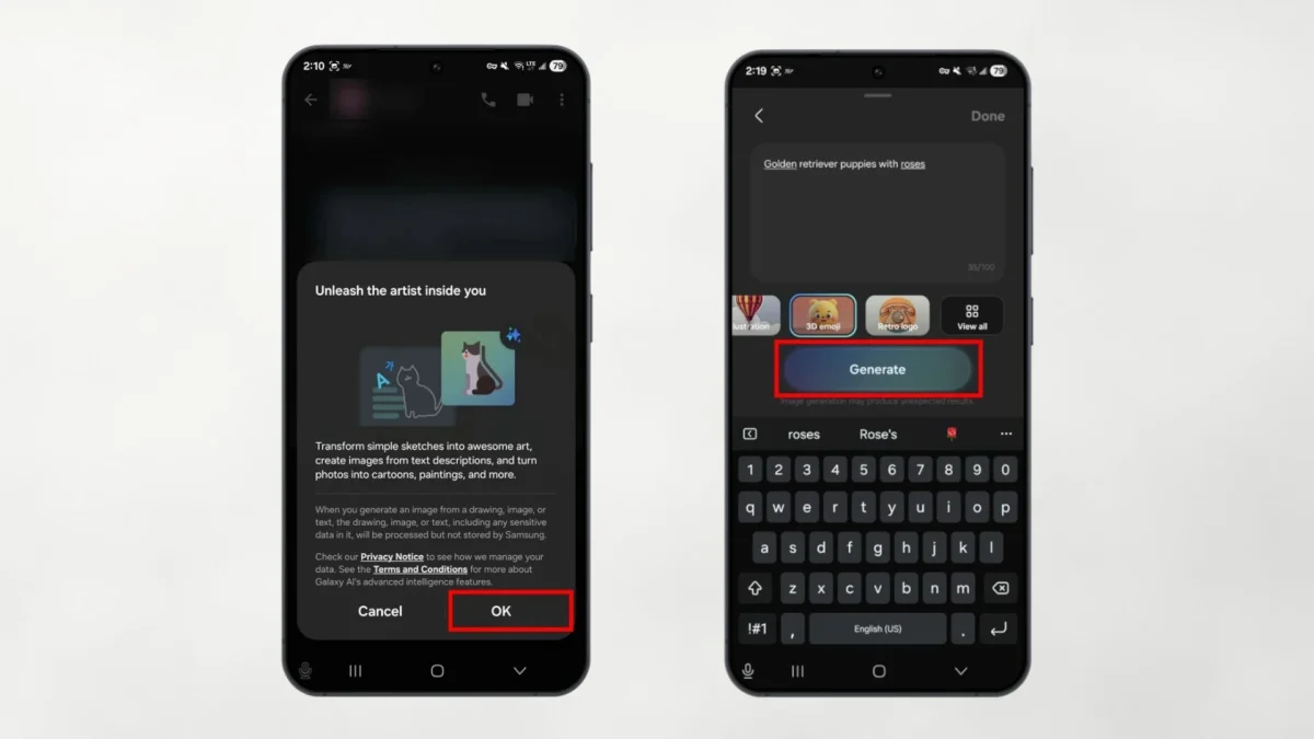 Si lo que quieres es crear un sticker completamente original, sin usar ninguna foto existente, Samsung también lo tiene resuelto. Esta opción vive en el propio teclado y usa Galaxy AI para generar la imagen a partir de una descripción de texto.