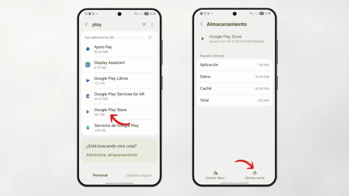 - Borra la caché de Google Play Store. Ve a Ajustes → Aplicaciones → Google Play Store → Almacenamiento → Limpiar caché. Esto no afecta a tus apps ni a tus compras; simplemente borra datos temporales que pueden estar causando el problema. Reinicia y vuelve a intentarlo.