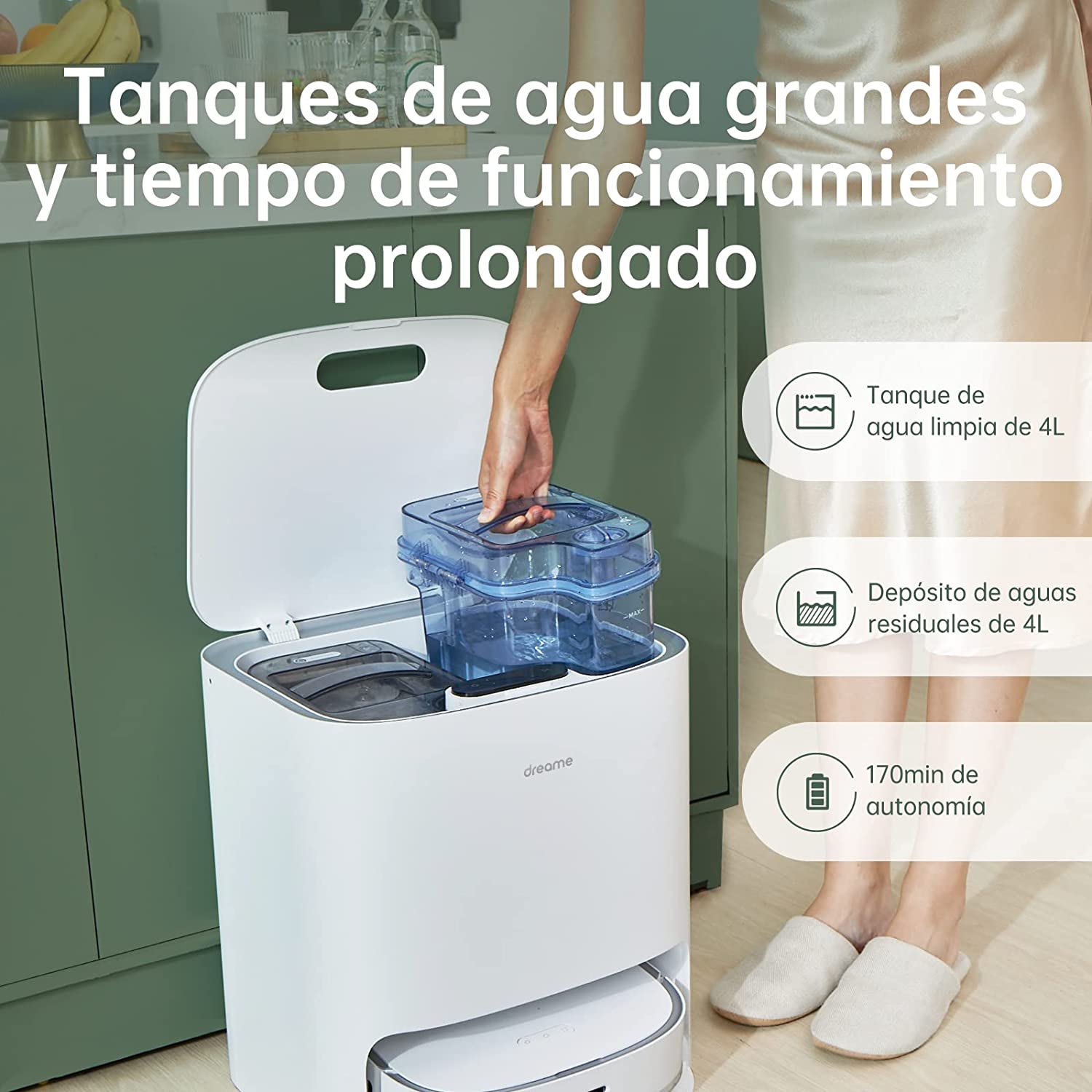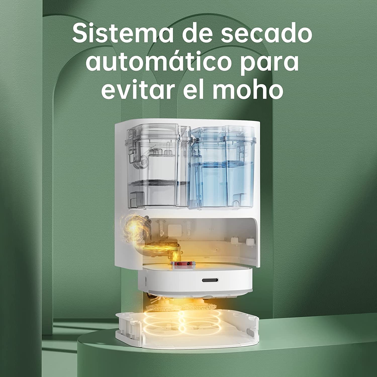Su base tiene un depósito para almacenar días y días de polvo y otro depósito con 4L de agua para reabastecer al robot y también limpiar las mopas. El agua sucia se almacena en otro depósito más y cuando las mopas están limpias las seca con aire caliente.