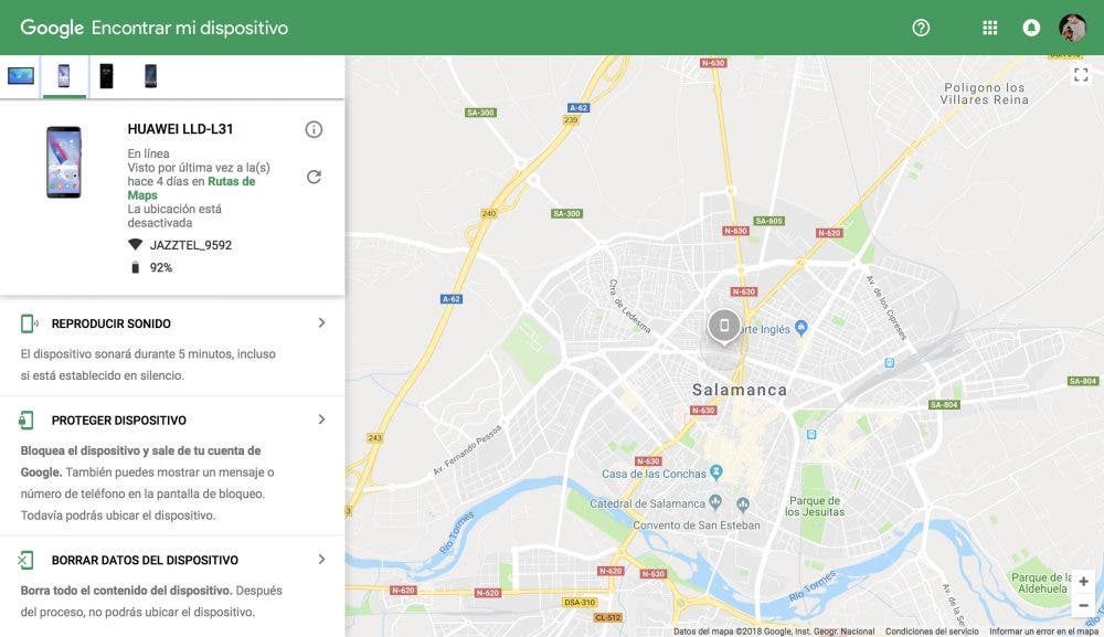 El segundo caso es el más común: hemos perdido el teléfono en casa y no tenemos ni idea de dónde encontrarlo. La mejor opción para encontrarlo es recurrir a la herramienta de Google de Encontrar mi dispositivo. Debido a que las últimas versiones de Android la integran de forma nativa, nuestro terminal debería contar con ésta de serie. Aprovechándonos de esta característica, nos iremos hasta la web de homónima de Google e introduciremos la cuenta de Gmail que tengamos registrada en el smartphone perdido. A continuación se nos mostrarán todos los dispositivos registrados con esa cuenta: tan simple como elegir el deseado y seleccionar la opción de Reproducir sonido.