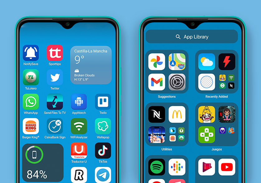 Y sí, hace su trabajo a la perfección. Cuenta con un paquete de iconos muy similar al de Apple, sus fondos de pantalla, el dock inferior y la popular App Library. ¡Incluso tiene los widgets que se implementaron hace poco!