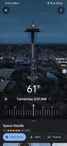 Además, incluye una función extra llamada «Hora y tiempo». Cuando estás navegando en 3D verás este botón en la zona inferior. Si lo pulsas podrás ver este mapa 3D en las diferentes horas del día de una manera hiperrealista.