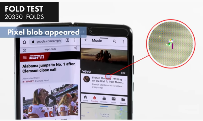 El experimento ha consistido en introducir el Galaxy Fold en un dispositivo de plegado automático que simula la apertura y cierre que podría realizar un usuario normal. Eso sí, de una forma mucho más rápida y continuada con la finalidad de saber cuál sería el aguante máximo del dispositivo. La compañía surcoreana afirma que los usuarios podrán superar los 120.000 pliegues en un transcurso de tres años de forma completamente normal. Pues bien, según las pruebas de SquareTrade, a los 20.000 pliegues los píxeles comienzan a desaparecer en algunos puntos de la pantalla. Las marcas son visibles, pero se hacen más evidentes cuando la máquina alcanza los 40.000 pliegues.