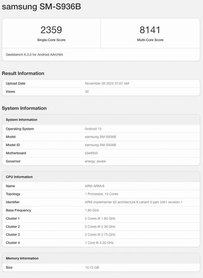 Según lo que vemos, estamos ante una CPU de 10 núcleos que alcanza hasta los 3,3 GHz en su núcleo principal, acompañado de dos núcleos de rendimiento a 2,75 GHz, cinco núcleos a 2,36 GHz y dos núcleos de bajo consumo a 1,8 GHz. La GPU es una Xclipse 950 basada en la arquitectura RDNA de AMD. Aunque este diseño parece prometedor, el puntaje en Geekbench queda muy por detrás del Dimensity 9400 y aún más del Snapdragon 8 Elite. Puede tratarse de una unidad en pruebas, pero si este fuera el puntaje final, la diferencia sería significativa.