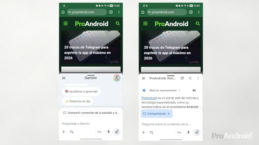 Lo verdaderamente útil no es solo que las ventanas compartan espacio, sino que se entiendan entre sí. La actualización refuerza el botón clave: compartir pantalla y contenido de la app. Al pulsarlo, Gemini analiza en tiempo real lo que ocurre en la otra mitad, ya sea un vídeo de YouTube o un correo electrónico. Esto elimina la fricción de hacer capturas manuales, ofreciendo respuestas contextuales al instante y acercando la productividad móvil a la de un escritorio.