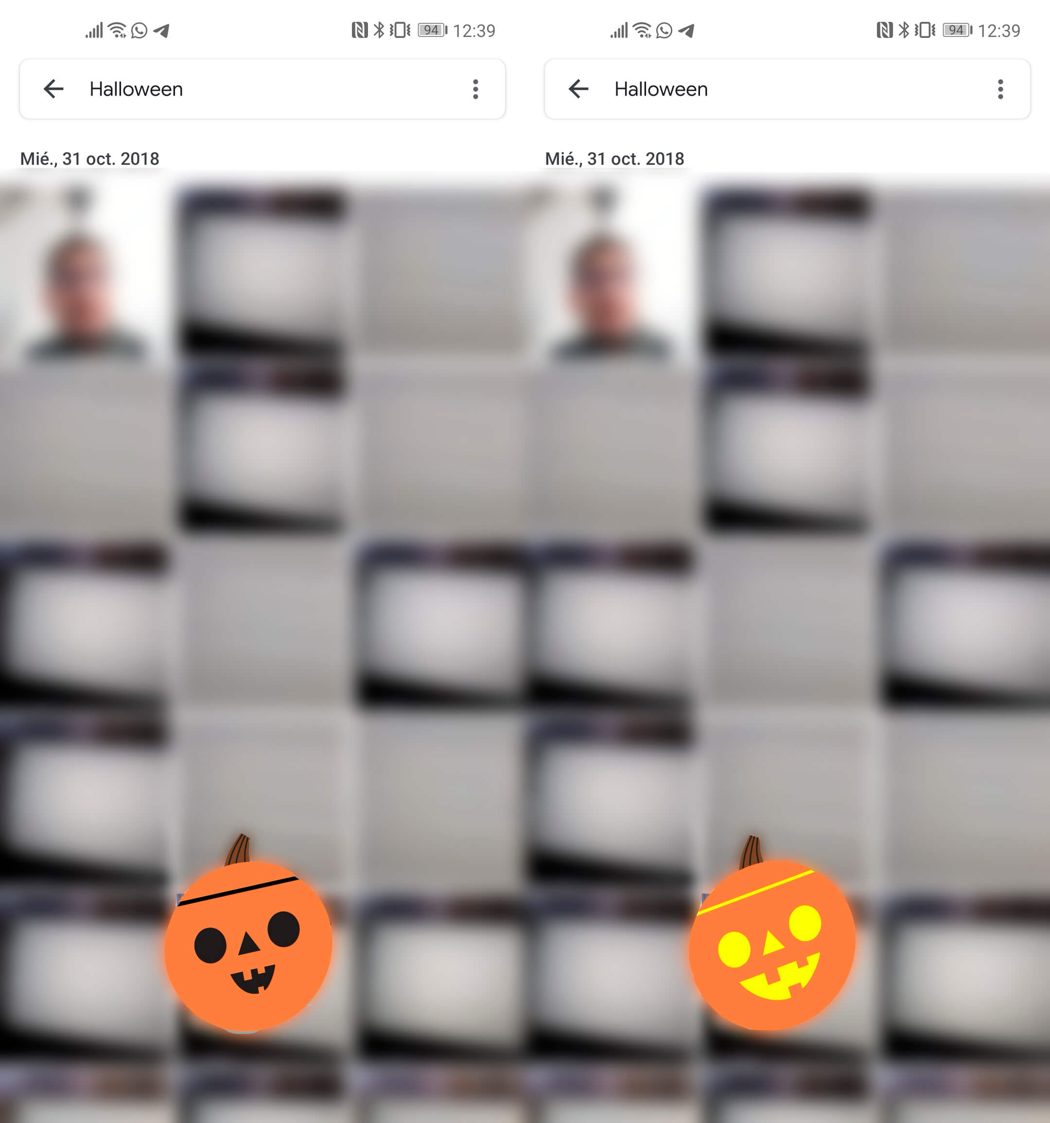 Primero hablemos del «truco» que nos muestra Google para Google Fotos. Ahora podemos buscar «Halloween» dentro de la aplicación y se nos mostrarán las fotografías que hayamos realizado los días 31 o 1 de noviembre de años anteriores. La verdad es que también esperábamos que solo nos mostrase las fotografías de disfraces, comida, decoración, etc. pero bueno, mejor es nada, así no tenemos que buscar la fecha concreta. La sorpresa es el easter egg que veremos al hacer esta búsqueda si contamos con la última versión de la aplicación instalada.