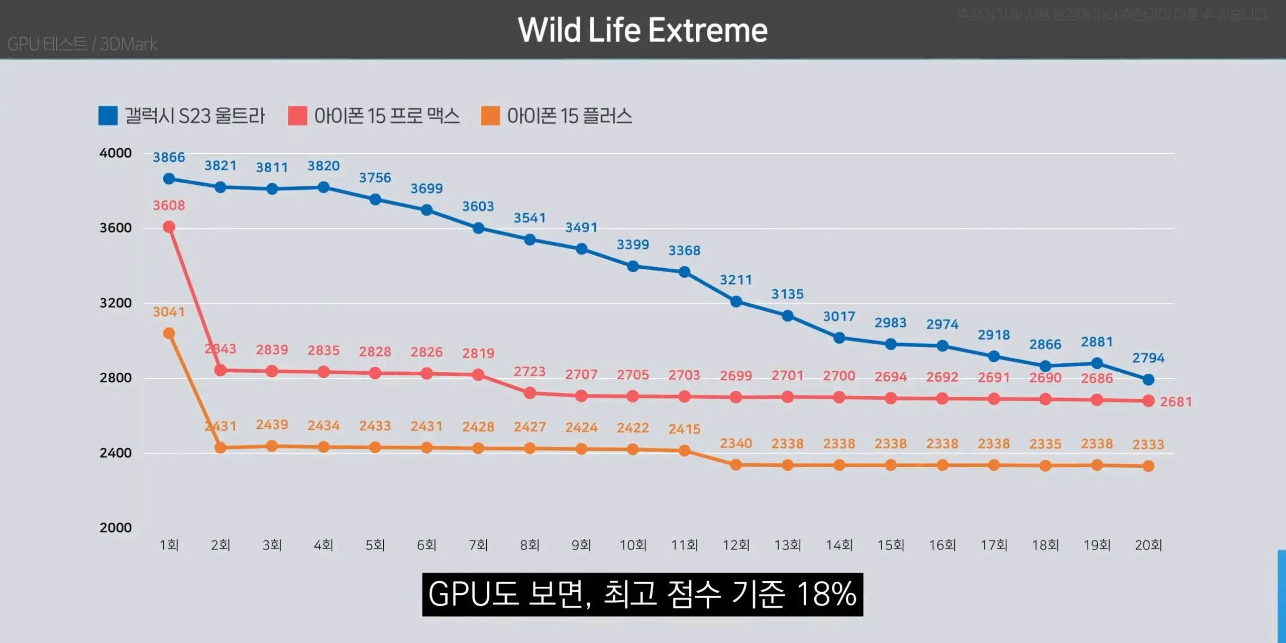 Nada más comenzar el Galaxy S23 Ultra ya se sitúa unos 200 puntos por encima del terminal de Apple. Lo curioso llega en el segundo punto de la prueba: el iPhone 15 Pro Max baja casi 1.000 puntos su rendimiento, mientras que el Samsung apenas baja.
