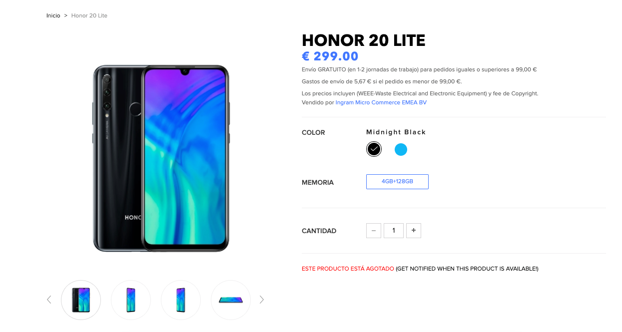 En estos momentos la página de Honor ya muestra este dispositivo a la venta. Por desgracia en el momento de escribir estás líneas los terminales se han agotado. No sabemos si la compañía ha lanzado un stock muy limitado o que espera abrir la venta oficial en pocas horas. Esto no significa que puedas reservarlo, simplemente visualizar las especificaciones del dispositivo desde la página oficial. El terminal no está disponible en Amazon, por lo que si quieres comprarlo lo mejor es que estés atento de la página oficial de Honor.