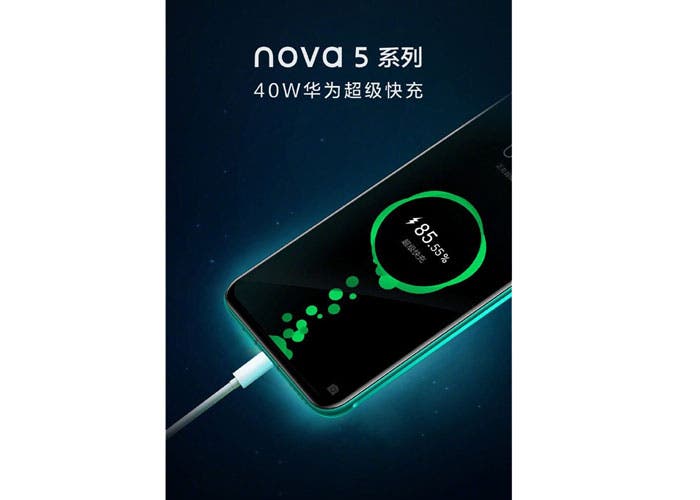 En otro apartado nos encontramos con una filtración que ha sorprendido a todo el mundo. Se trata de la incorporación de la carga rápida de 40W. Es decir, una de las cargas más rápidas del mercado que ya hemos podido probar en el P30 Pro y nos ha quedado alucinados. Y es que, tal y como vemos en el teaser del dispositivo, el Huawei Nova 5 será capaz de recargar su batería al completo en poco menos de una hora. A nivel interno, el nuevo terminal de Huawei contará con el Kirin 810 como procesador y vendrá acompañado de dos configuraciones de 6 y 8 GB y 256 GB de almacenamiento interno. Según las filtraciones, la pantalla del Nova 5 será de 6,9 pulgadas y contará con una resolución FullHD y la tecnología AMOLED.