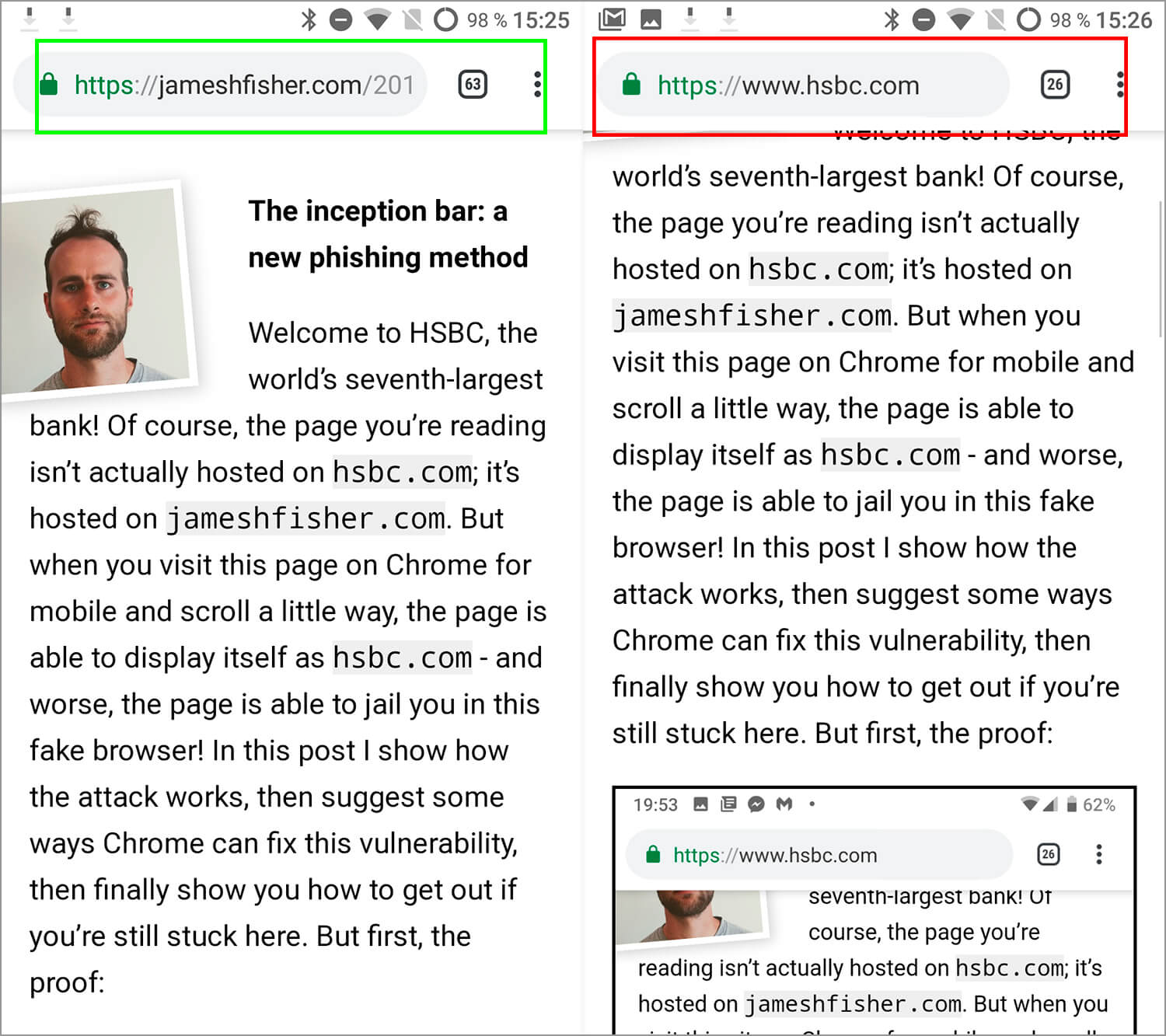 Cómo podemos leer en la página web de James Fisher, este nuevo método se basa en encerrar al usuario en una página web mientras le hace creer que todo funciona normalmente. Antes os hemos comentado que este método de phishing va orientado a los usuarios de Google Chrome pero, ¿por qué? Pues básicamente porque inception bar utiliza la misma interfaz que el navegador de Google, como os mostramos en imágenes. De normal, cuando visitamos una página web desde Chrome, al hacer un poco de scroll, la barra de búsqueda desaparece. En una web con este método no lo hace, bueno, realmente sí, pero una nueva barra aparece en la parte superior, de igual diseño, pero donde la dirección de la página web es diferente, al igual que el número de ventanas abiertas.