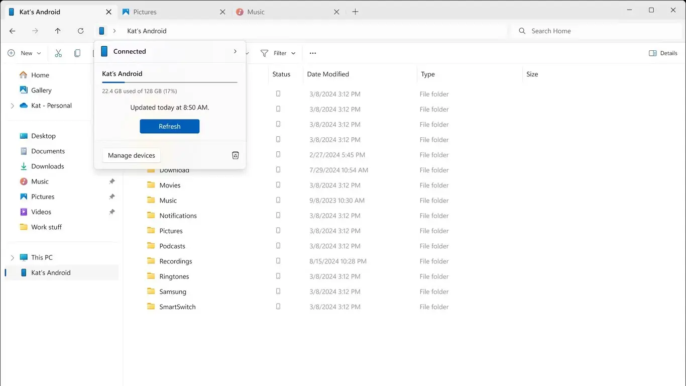 Mediante los amigos de XDA, se ha descubierto una funcionalidad que se encuentra en estado Beta, tanto en la app de Enlace como en el programa Insider de Windows, donde explorar los archivos del móvil será una posibilidad de forma nativa. En la imagen filtrada, vemos cómo sería su funcionamiento: ahora, mediante el típico explorador de archivos que aparece en nuestro ordenador al conectar el móvil, podremos navegar por la memoria del terminal de forma inalámbrica.