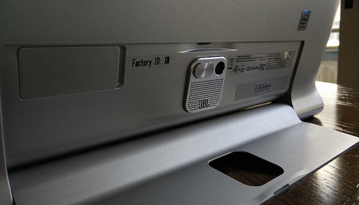 Por otra parte nos encontramos una de las características más llamativas de esta Lenovo Yoga Tablet 2 Pro y es el proyector que encontraremos en su lateral derecho, capaz de proyectar una pantalla hasta las 50 pulgadas en resolución 854 x 480 píxeles. A simple vista puede parecer escasa, pero os voy a ser sinceros, es una gozada poder ver películas proyectadas en la pared con este tamaño, habiendo llegado yo incluso hasta las casi 70 pulgadas con un desenfoque mínimo. El porqué es bien sencillo y es que la pantalla proyectada la vamos a visualizar desde varios metros de distancia, con lo que los píxeles no los lograremos distinguir. No os voy a engañar, no esta al nivel de un proyector como tal, no alcanza esos tamaños de pantalla ni esas resoluciones, pero es un valor añadido a esta tablet que la convierte en algo prácticamente único. Sea cual sea la forma en que disfrutemos del contenido multimedia los dos altavoces frontales firmados por JBL y el trasero con tecnología DOLBY ATMOS hacen que la calidad de sonido y el volumen sean casi excelentes.