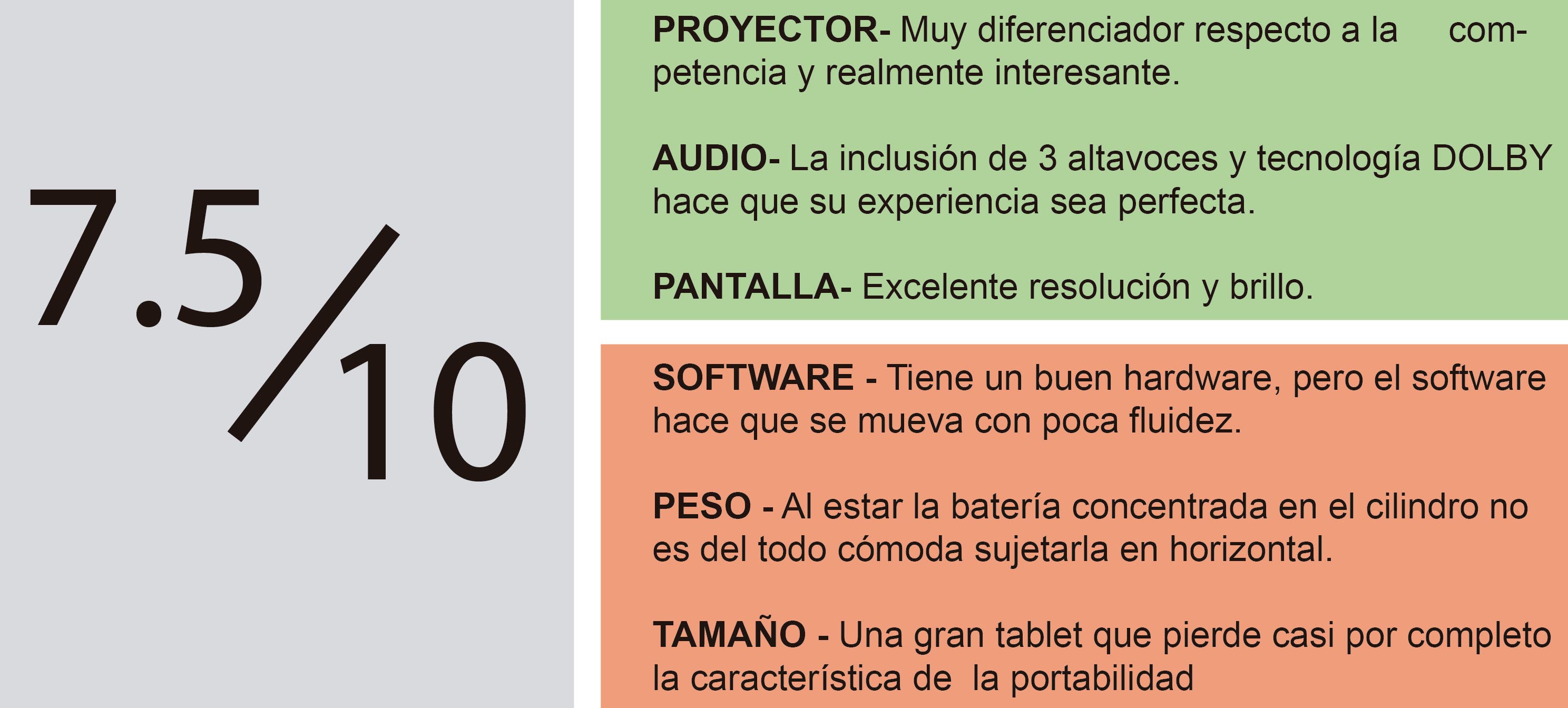 En la parte frontal de la tablet nos encontraremos dos grandes altavoces en estéreo de los cuales ya hablaremos más adelante. En la parte izquierda encontraremos el botón de encendido, las teclas de volumen y las entradas MicroUSB y Jack 3.5. En el lado derecho encontraremos el botón para accionar el proyector y la lente de este. Por último en la parte trasera encontraremos la cámara de 8 megapíxeles, un altavoz con función de subwoofer, el soporte ya mencionado y una ranura para tarjetas MicroSD.