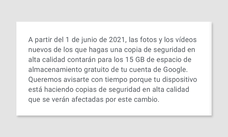 Se trata de una opción muy útil que puede ahorrarte varios GB de espacio cuando empieces a utilizar Google Fotos a partir del día 1 de junio. No es necesario liberar espacio antes del día 1 de junio, pues todo lo que subas antes no contará dentro de los 15 GB.
