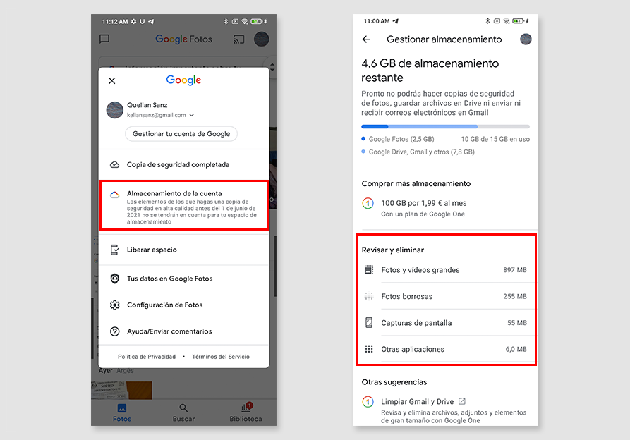 Esta herramienta la encontrarás cuando pulses sobre tu perfil y después sobre ‘Almacenamiento de la cuenta‘. En esta sección encontrarás un apartado llamado ‘Revisar y Eliminar‘ con diferentes opciones. Esta nueva herramienta busca entre toda tu copia de seguridad capturas de pantalla, fotografías borrosas y archivos extremadamente grandes que probablemente no quieras tener.