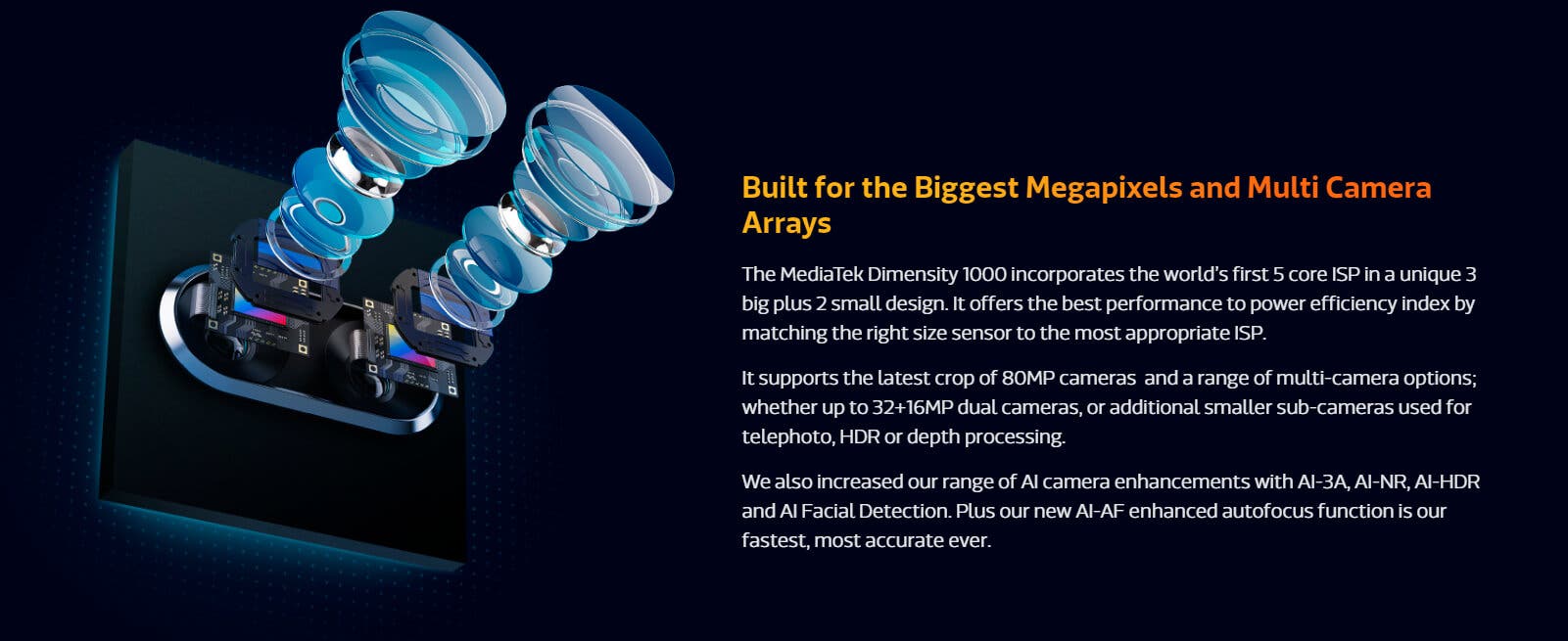 Este procesador es compatible con pantallas en resolución FullHD+ hasta a 120 Hz de tasa de refresco y en resolución QuadHD+ hasta a 90 Hz, por lo que la gama media también podrá comenzar a optar por pantallas con altas tasas de refresco. El Dimensity 1000 soporta múltiples cámaras, pero como máximo, la principal podrá tener 80 megapíxeles o un combo de dos sensores de 32 y 16 megapíxeles de forma simultánea. En su web oficial podemos leer que no hay problema al incluir más sensores de menor resolución.