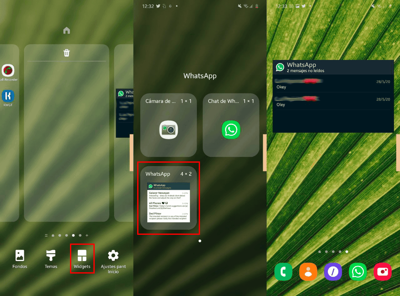 Es un widget bastante grande que se puede redimensionar para mostrar más contenido. Es interactivo, pues puedes hacer scroll sobre él para ver más mensajes. Este widget muestra los mensajes que tienes pendientes de leer en WhatsApp, ya sea de un usuario o de un grupo. Te indica de qué conversación viene y qué dice el mensaje.