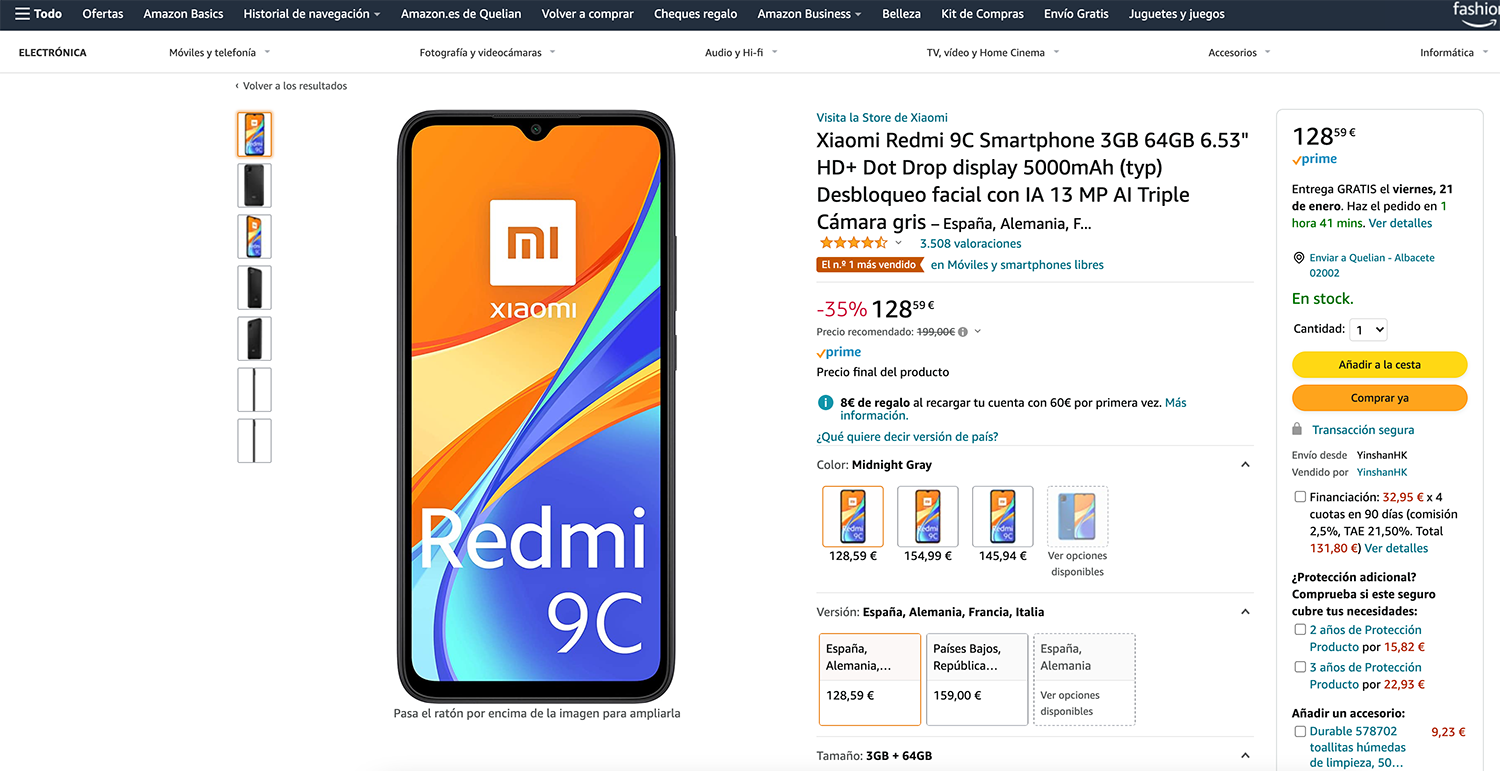 Navegando por las ofertas de Amazon nos hemos percatado de que el móvil número 1 en la plataforma es el Redmi 9C y que hoy está en oferta. Amazon marca un PVPr de 199 euros y solo durante el tiempo de la oferta se puede comprar a 129 euros. Es un descuento de 70 euros que no se suele ver en móviles de este rango de precio.