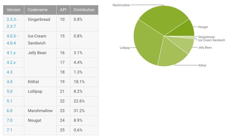 Llevamos mucho tiempo diciéndolo, y parece que la cosa sigue igual desde hace varios años. A Google le cuesta varios años que una de sus versiones sea medianamente usada. En estos momentos, Android 6.0 Marshmallow cuenta con el 31,2% del pastel, mientras que Lollipop con el 30,8%. Esto son cifras demasiado altas para hablar de versiones que llevan un año y medio y dos años y medio en el mercado. Pero lo sorprendente no acaba aquí, ya que Android KitKat cuenta con el 18,8% de los dispositivos que todos los meses se conectan a Google Play.