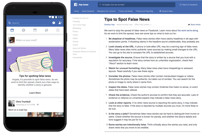 Ahora la aplicación nos ayudará a encontrar notificas falsas en Facebook nada más entrar. Como vemos en la imagen, a un usuario le ha enseñado esa notificación en la que vemos como le advierte que hay noticias falsas en Facebook, y si le da a «Aprender más», podemos ver diez consejos para no saber cuáles son: