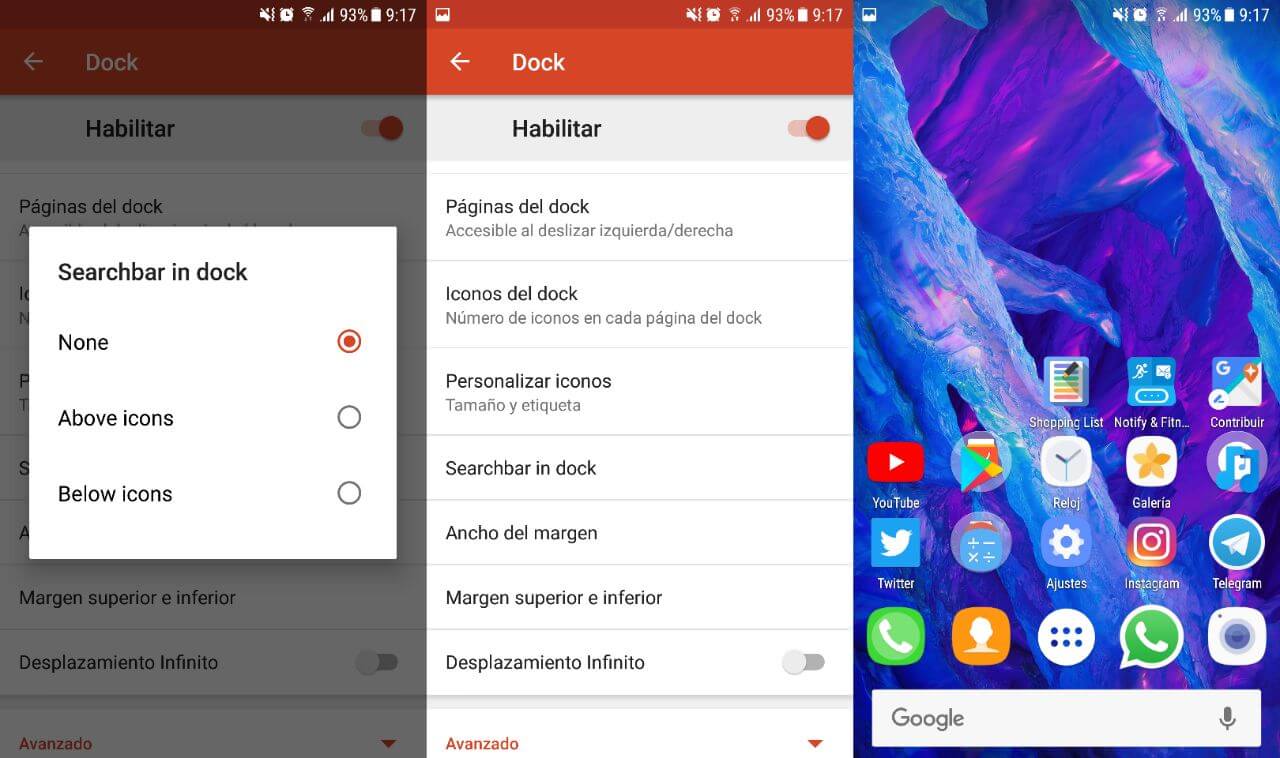 Tan solo tenemos que ir hasta el apartado de ‘Dock’ y seleccionar ‘Searchbar in Dock’. Una vez lo hagamos nos aparecerá una ventana emergente para indicarnos si la queremos por encima de la primera fila de iconos o por debajo. Si queremos tener el mismo aspecto que el Google Pixel 2 debemos indicar que se coloque debajo. Después de esto puedes cambiar el aspecto de la barra a tu antojo, ya que por defecto aparece una cuadrada con esquinas rectas.
