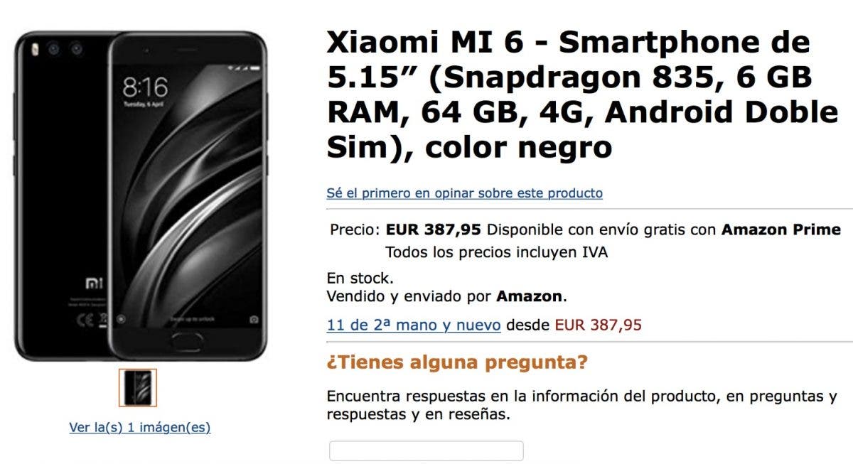 A día de hoy podemos hacernos con este smartphone por un precio de tan solo 388 euros en la tienda de Amazon. El mismo esta vendido y distribuido por la propia web, por lo no deberíamos tener ningún tipo de problema. La garantía y el servicio post-venta es de dos años, y disfruta del servicio de Amazon Prime. Recordemos que el Xiaomi Mi 6 se encuentra en la tienda oficial de Xiaomi a un precio de 449 euros, unos 70 euros más caro que en esta oferta. Sin duda alguna, esta es la mejor opción para hacerse con éste.