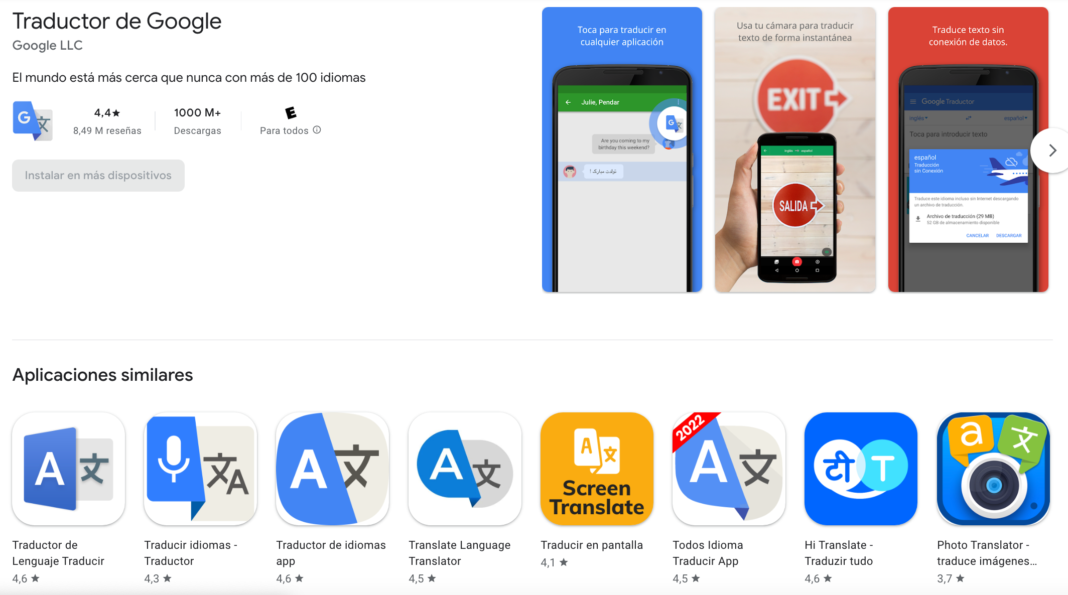 Un buen ejemplo es el propio traductor de Google. Si buscas esta app en Google Play encontrarás decenas de resultados que intentan engañarte para instalar una app que realmente no es de Google.