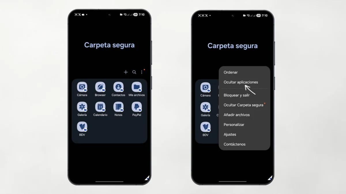 Samsung incluye en One UI una herramienta llamada Carpeta segura, que va bastante más allá de simplemente esconder iconos. Crea un espacio cifrado dentro del móvil, protegido por la plataforma de seguridad Samsung Knox, al que solo se puede acceder con PIN, patrón, contraseña o huella dactilar.