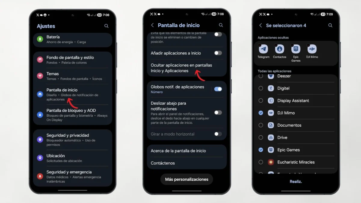 Listo. El icono desaparecerá tanto del escritorio como del cajón. Para abrir esa aplicación mientras está oculta, puedes ir a Ajustes > Aplicaciones, buscarla en el listado y abrirla desde ahí. Y si en algún momento quieres recuperar su icono, repite el mismo proceso y elimínala de la lista de apps ocultas.