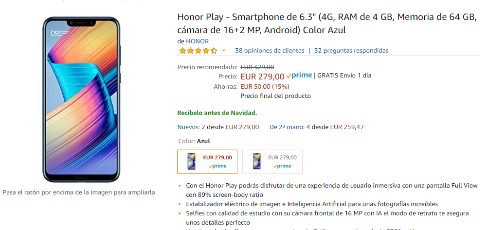 Otra cosa no, pero Honor lo está haciendo bastante bien este año en el mercado de los smartphones. La submarca de Huawei ha conseguido posicionarse como una de las compañías chinas más populares en nuestro país gracias a la llegada de terminales como el Honor 8X o el Honor Play. Este último puede definirse como uno de los mejores móviles de la gama media y todo un seguro a nivel de fluidez y rendimiento en los videojuegos para móvil. Y es que el aspecto que menos gusta entre los usuarios es que su precio oficial está muy cercano a los 330 euros. Sin embargo, aquí está Amazon para mejorar la oferta, ya que ahora podemos encontrar el Honor Play con un descuento de 50 euros ¡No te lo pierdas!
