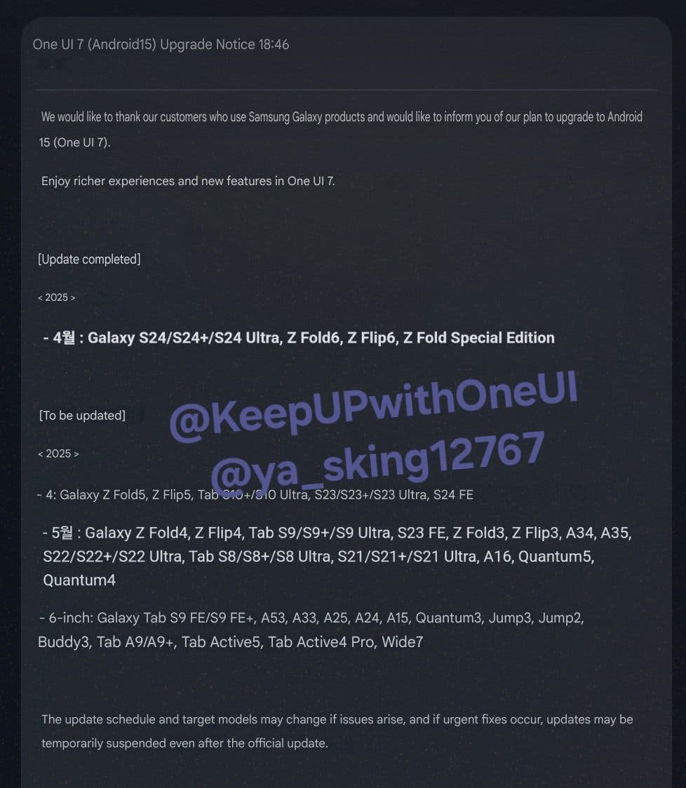 Galaxy Tab S9 FE/S9 FE+, Galaxy A73, A53, A33, A25, A24, A15, Quantum3, Jump3, Jump2, Buddy3, Galaxy Tab A9/A9+, Tab Active5, Tab Active4 Pro, Wide7.