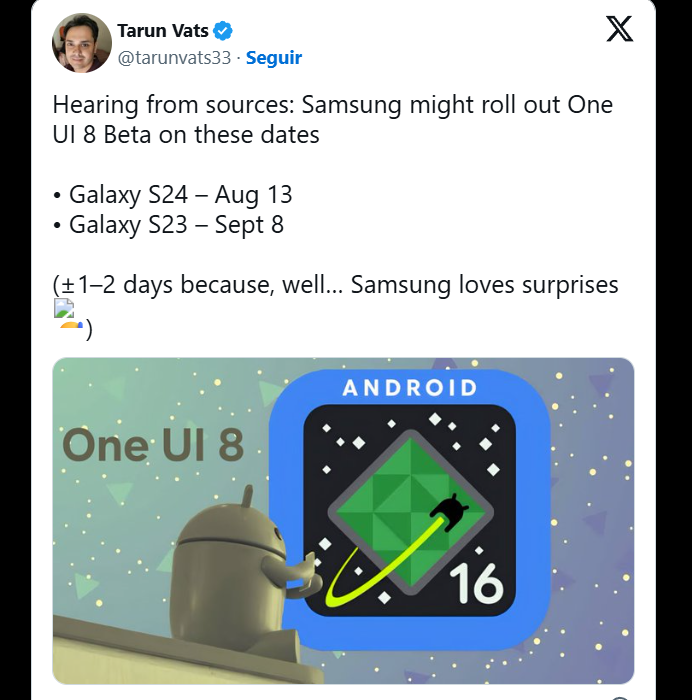 Según comenta el leaker Tarun desde su cuenta en X, Samsung ya habría definido las fechas concretas para la disponibilidad de One UI 8 con Android 16 beta para los Galaxy S24 y S23. Primero tenemos a la serie Galaxy S24, cuyo despliegue, según la fuente, comenzaría a partir del 13 de agosto, probablemente en mercados limitados, como suele hacer el fabricante en estos casos.