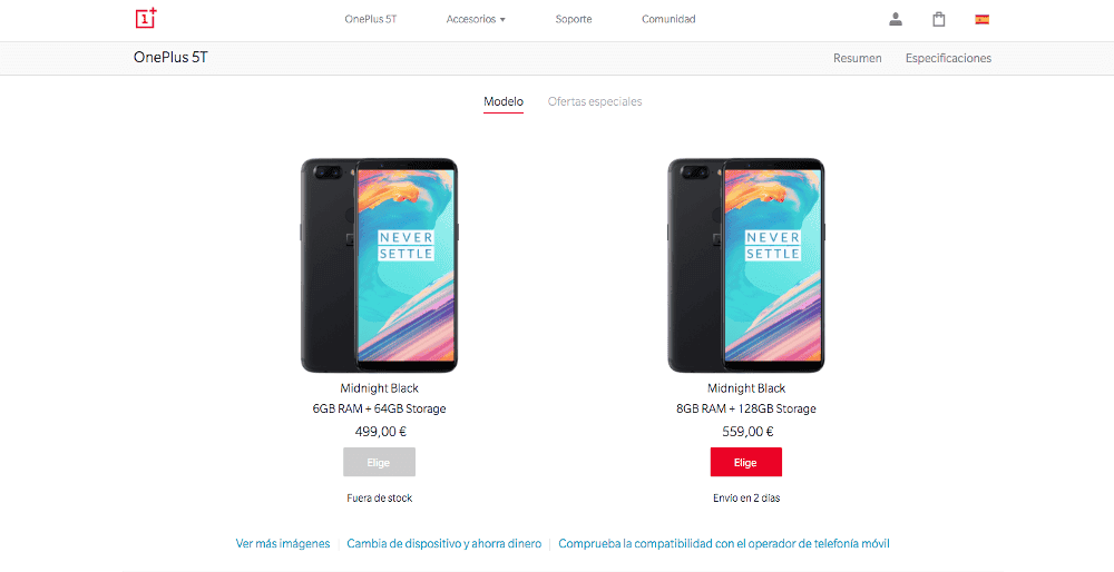 La compañía no dice nada de temporalmente, sino que directamente nos avisa de que no hay stock disponible para este dispositivo. En Estados Unidos no se puede comprar ninguno de los dos modelos, pero en España todavía podemos acceder a la versión de 8 GB de RAM y 128 GB de almacenamiento. Según los medios internacionales más importantes, este stock no se repondrá más, por lo que para comprar un OnePlus desde la tienda oficial deberemos esperar hasta la salida del OnePlus 6.